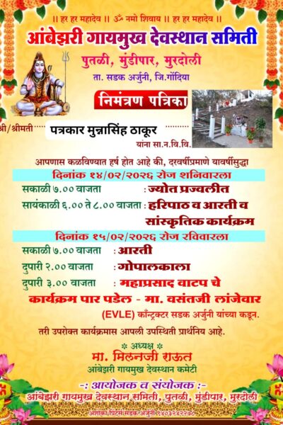 त्रिदिवसीय स्नेहसंमेलन उत्साहपूर्वक संपन्न सड़क/अर्जुनी : यहाँ के विद्यालय में दिनांक 22 से 24 दिसंबर 2025 तक आयोजित त्रिदिवसीय स्नेहसंमेलन विविध कार्यक्रमों के साथ बड़े उत्साह में संपन्न हुआ। दिनांक 22 दिसंबर को स्नेहसंमेलन का उद्घाटन माननीय विधायक श्री राजकुमारजी बडोले के शुभहस्ते संपन्न हुआ। सह-उद्घाटक के रूप में श्री चेतनभाऊ वडगाये (सभापति, पंचायत समिति, […]