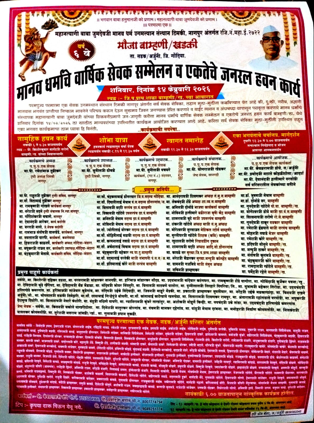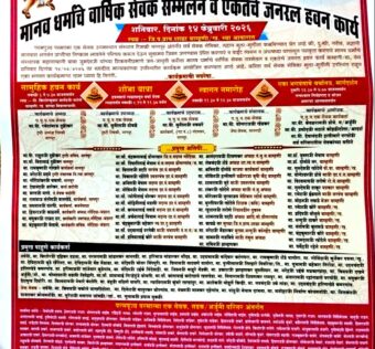 बामणी-खडकी येथे मानवधर्माचे वार्षिक सेवक संमेलन व एकतेचे जनरल हवन 14 फारवरी ला बामणी-खडकी (ता. सडक अर्जुनी) : महानत्यागी बाबा जुमदेवजी मानवधर्म उगमस्थान टिमकी, नागपूर यांच्या मार्गदर्शनाखाली मानवधर्माच्या विचारांचा प्रचार-प्रसार व समाजात एकतेचा संदेश देण्यासाठी मानवधर्माचे वार्षिक सेवक संमेलन व एकतेचे जनरल हवन कार्य दिनांक शनिवार 14 फेब्रुवारी 2026 रोजी ग्राम बाम्हणी-खडकी येथील जिल्हा परिषद […]