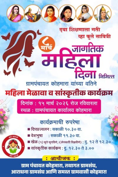 कोहमारा येथे जागतिक महिला दिनानिमित्त महिला मेळावा व सांस्कृतिक कार्यक्रम सडक अर्जुनी : प्रतिनिधी जागतिक महिला दिनानिमित्त ग्रामपंचायत कोहमारा यांच्या वतीने १५ मार्च २०२६ रोजी रविवारी ग्रामपंचायत कार्यालय कोहमारा येथे महिला मेळावा व विविध सांस्कृतिक कार्यक्रमांचे आयोजन करण्यात आले आहे. महिलांच्या सन्मानासाठी व त्यांच्या कर्तृत्वाला प्रोत्साहन देण्यासाठी हा कार्यक्रम आयोजित करण्यात आला आहे. कार्यक्रमाची सुरुवात […]