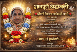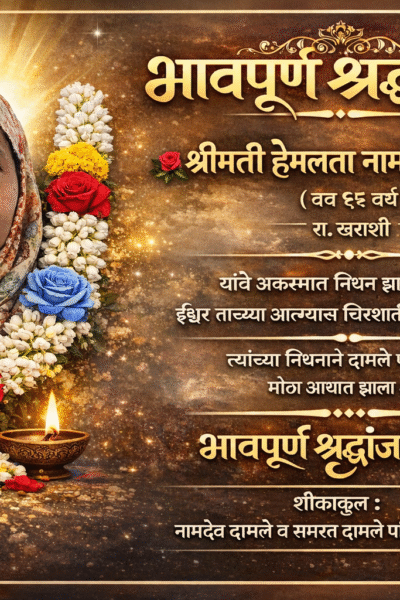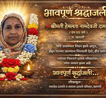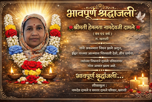 दु:खद बातमी! हेमलता दामले यांचे आकस्मिक निधन; ग्रामस्थांत हळहळ खराशी : येथील रहिवासी श्रीमती हेमलता नामदेवजी दामले (वय 55 वर्ष) यांचे आज दिनांक 23 मार्च 2026 रोजी दुपारी 3 वाजताच्या सुमारास आकस्मिक निधन झाले. या घटनेमुळे संपूर्ण खराशी गावावर दुःखाचा डोंगर कोसळला असून ग्रामस्थांमध्ये हळहळ व्यक्त होत आहे. स्वभावाने प्रेमळ, मनमिळाऊ व सर्वांशी जिव्हाळ्याने वागणाऱ्या […]